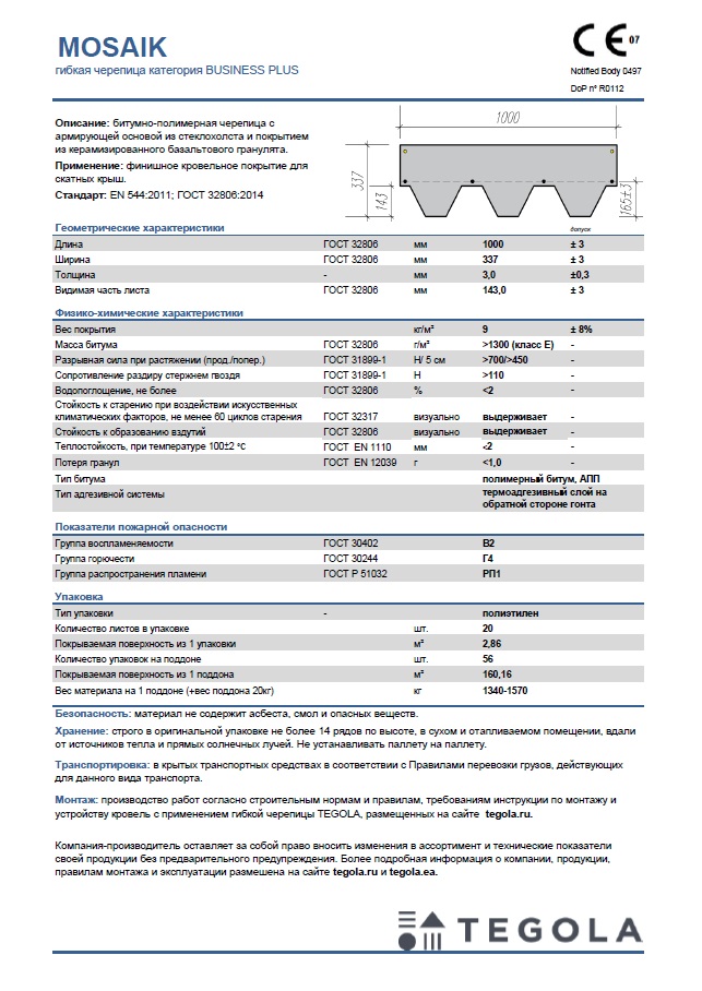 Технический лист гибкая черепица MOSAIK