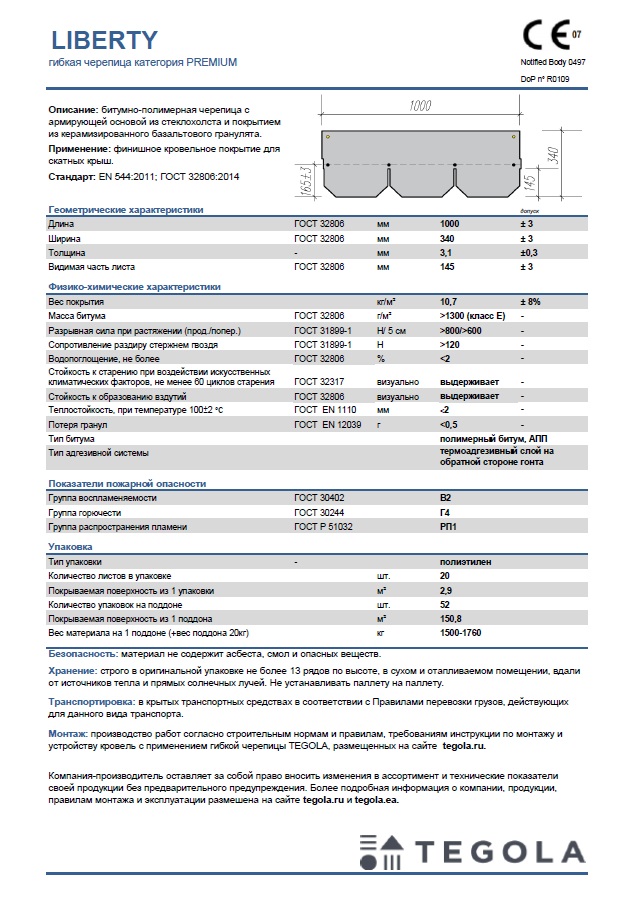 Технический лист гибкая черепица LIBERTY