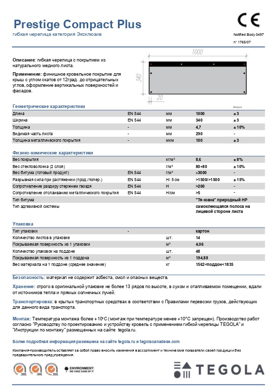 Технический лист черепица ТЕГОЛА Престиж компакт Плюс