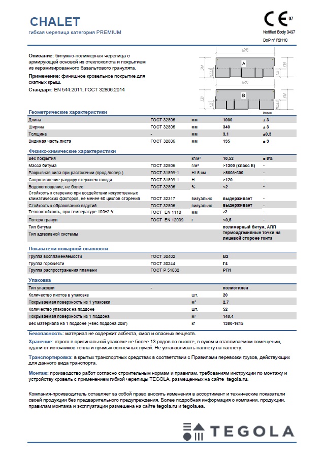 Технический лист гибкая черепица CHALET