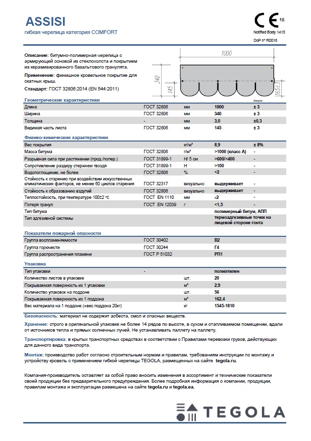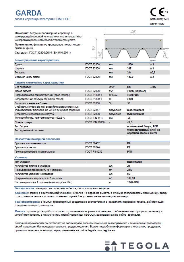 Технический лист гибкая черепица GARDA