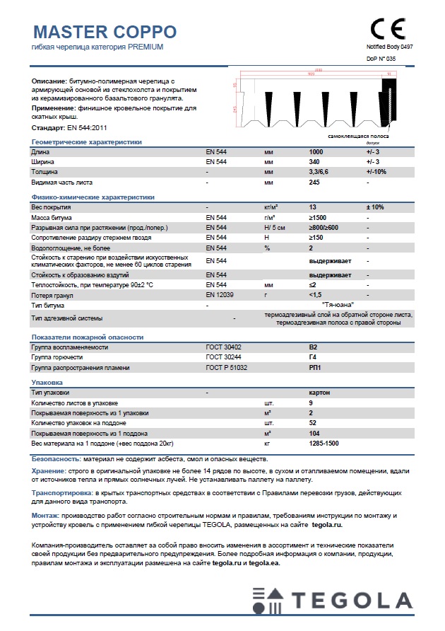 Технический лист гибкая черепица MASTER COPPO