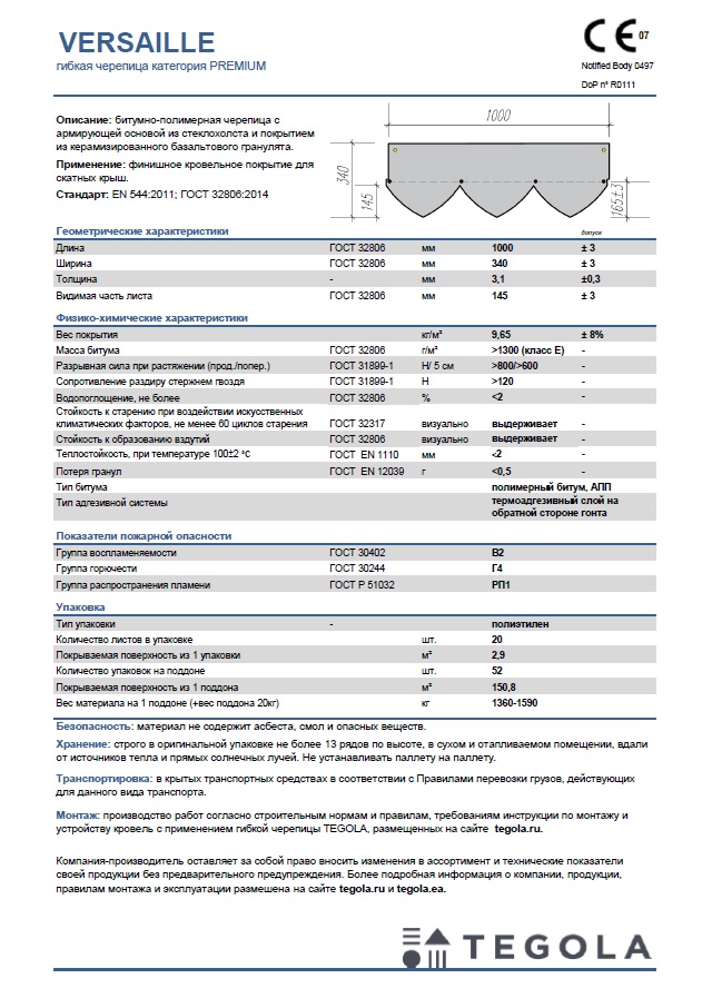 Технический лист гибкая черепица VERSAILLE
