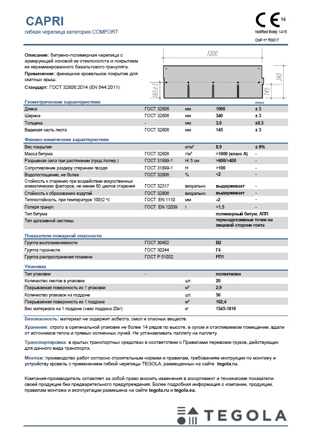 Технический лист гибкая черепица CAPRI
