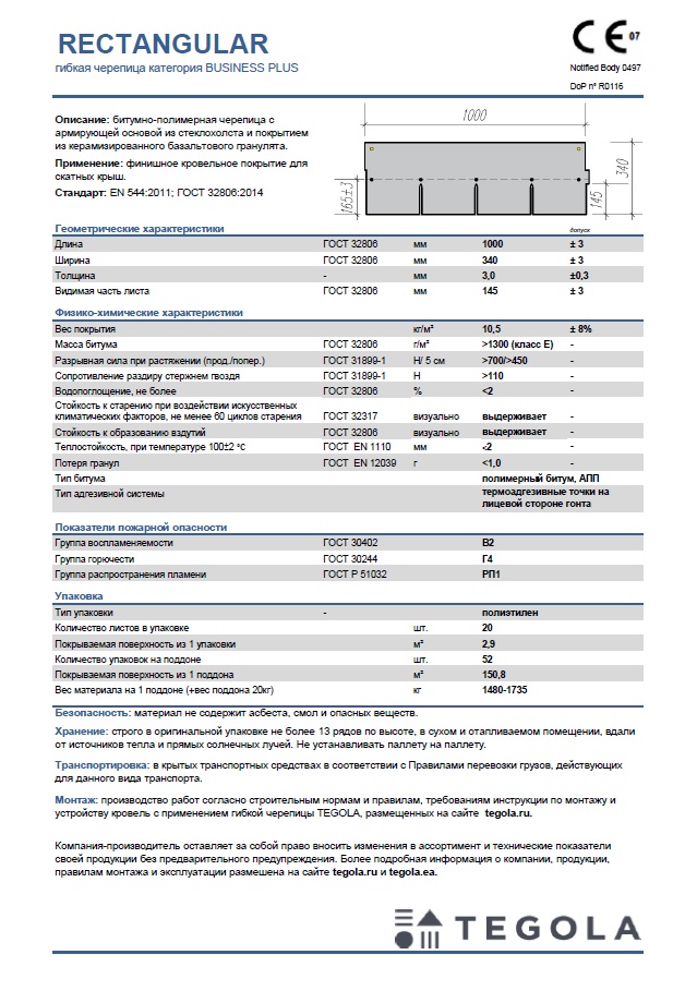 Технический лист черепица ТЕГОЛА коллекции БИЗНЕС_КОМФОРТ ПЛЮС_КОМФОРТ