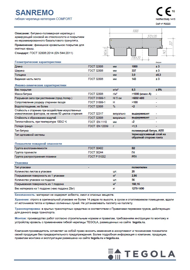 Технический лист гибкая черепица SANREMO