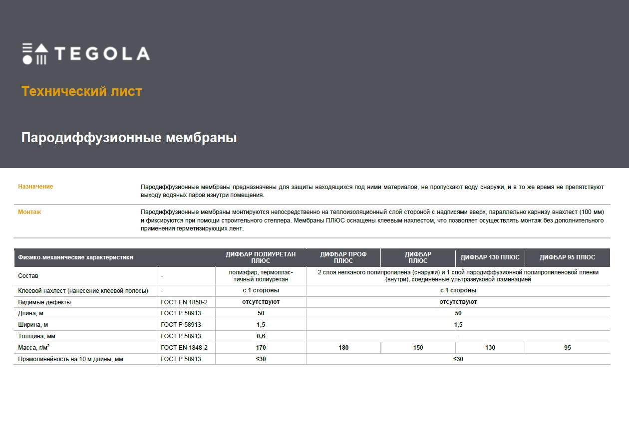 Технический лист пародиффузионные мембраны Дифбар