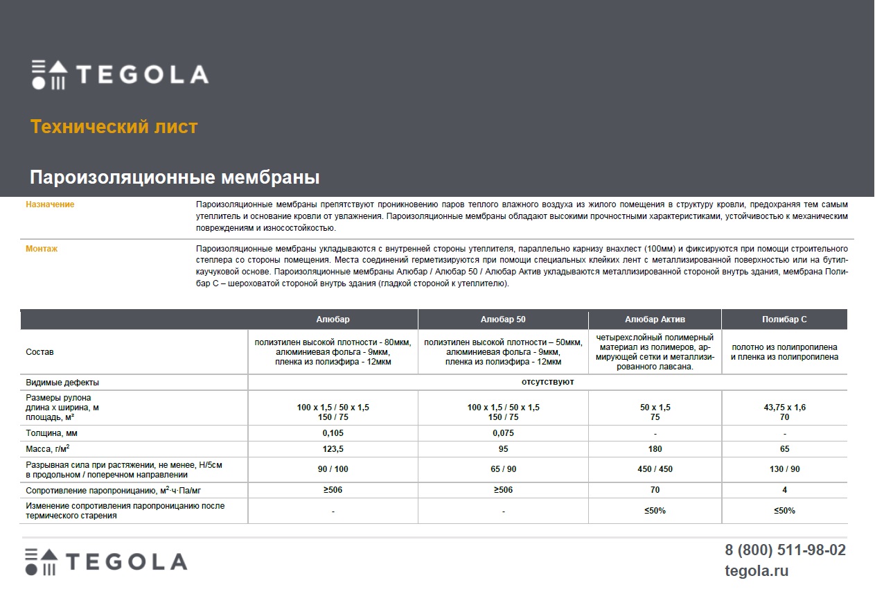 Технический лист пароизоляционные мембраны Алюбар, Алюбар 50, Алюбар Актив, Полибар С