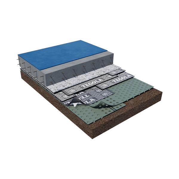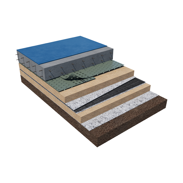Профилированная мембрана ТЕФОНД предотвращает утечку цементного молочка в слой щебня. Конструкция такого пола позволит снизить затраты на планировочные работы, связанные с удалением слабых грунтов, их укреплением и устройством подстилающих слоев.