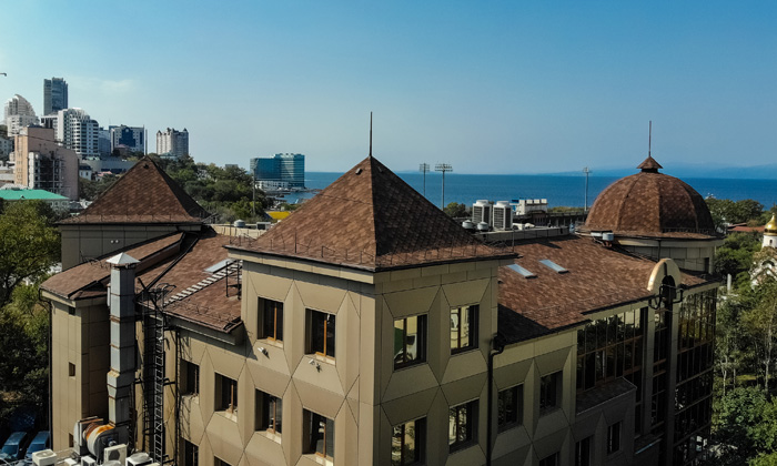 На объекте была использована премиальная гибкая черепица TEGOLA ВЕРСАЛЬ коричневый мореон. Оригинальная ромбовидная форма черепицы украсила крышу, придав ей особое изящество, присущее дворцовой архитектуре.