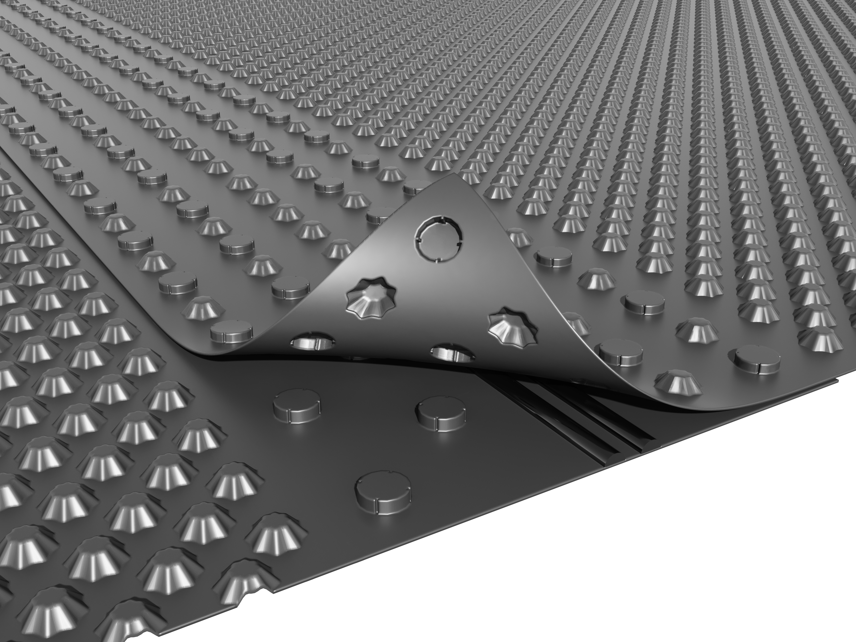 Профилированная мембрана Тефонд НР Стар – это усиленная мембрана из полиэтилена высокой плотности серого цвета с равномерно размещенными по всей площади выступами в форме усеченных конусов высотой 7,5 мм. Выступы профилированной мембраны имеют ребра жесткости. Для соединения рулонов в продольном направлении мембрана снабжена штатным механическим замком с битумным герметизирующим составом в его конструкции. Битумный герметик защищен антиадгезионной пленкой, которую необходимо удалить непосредственно перед соединением рулонов.