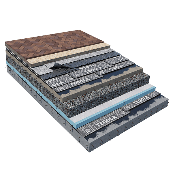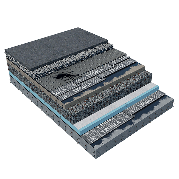 При устройстве кровельного пирога эксплуатируемых кровель возникает несколько сложных задач: обеспечить эффективную гидроизоляцию железобетонного основания, защитить водоизоляционный ковер от повреждения вследствие механических нагрузок на кровлю, обеспечить дренаж для отвода атмосферных осадков. Оптимальным вариантом для решения этих задач, сочетающим доступные цены и большой срок службы, считаются системы с использованием материалов TEGOLA.